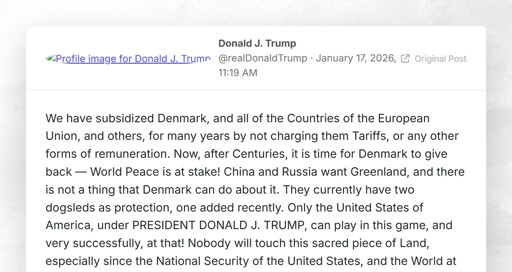 We have subsidized Denmark, and all of the Countries of the European Union, and others, for many years by not charging them Tariffs, or any other forms of remuneration. Now, after Centuries, it is time for Denmark to give back — World Peace is at stake! China and Russia want Greenland, and there is not a thing that Denmark can do about it. They currently have two dogsleds as protection, one added recently. Only the United States of America, under PRESIDENT DONALD J. TRUMP, can play in this game, and very successfully, at that! Nobody will touch this sacred piece of Land, especially since the National Security of the United States, and the World at large, is at stake. On top of everything else, Denmark, Norway, Sweden, France, Germany, The United Kingdom, The Netherlands, and Finland have journeyed to Greenland, for purposes unknown. This is a very dangerous situation for the Safety, Security, and Survival of our Planet. These Countries, who are playing this very dangerous game, have put a level of risk in play that is not tenable or sustainable. Therefore, it is imperative that, in order to protect Global Peace and Security, strong measures be taken so that this potentially perilous situation end quickly, and without question. Starting on February 1st, 2026, all of the above mentioned Countries (Denmark, Norway, Sweden, France, Germany, The United Kingdom, The Netherlands, and Finland), will be charged a 10% Tariff on any and all goods sent to the United States of America. On June 1st, 2026, the Tariff will be increased to 25%. This Tariff will be due and payable until such time as a Deal is reached for the Complete and Total purchase of Greenland. The United States has been trying to do this transaction for over 150 years. Many Presidents have tried, and for good reason, but Denmark has always refused. Now, because of The Golden Dome, and Modern Day Weapons Systems, both Offensive and Defensive, the need to ACQUIRE is especially important. Hundreds of Billions of Dollars are currently being spent on Security Programs having to do with “The Dome,” including for the possible protection of Canada, and this very brilliant, but highly complex system can only work at its maximum potential and efficiency, because of angles, metes, and bounds, if this Land is included in it. The United States of America is immediately open to negotiation with Denmark and/or any of these Countries that have put so much at risk, despite all that we have done for them, including maximum protection, over so many decades. Thank you for your attention to this matter!DONALD J. TRUMPPRESIDENT OF THE UNITED STATES OF AMERICA