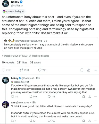 and disagree strongly with this. part of the mission of TechTakes and SneerClub is that they must remain a space where marginalized people are welcome, and we know from prior experience that the only way to guarantee that is to ensure that bigots and boosters (and sometimes they’re absolutely the same person — LLMs are fashtech after all) can’t ever control the discourse. I know through association that a lot of moderated AI-critical spaces, writers, and researchers follow a similar mission.