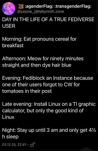 arrow-up1651arrow-down1imageDay in the Life of a True Fediverse Usersh.itjust.worksSamskara@sh.itjust.works to Fediverse memes@feddit.ukEnglish · 1 month agomessage-square128linkfedilink